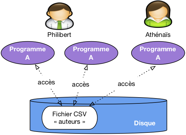 Peut-on se satisfaire de cette solution et imaginer que nous pouvons construire des applications en nous appuyant directement sur des fichiers structurés, par exemple des fichiers CSV ? C’est la méthode illustrée par la figure ci-dessous. Dans une telle situation, chaque utilisateur applique des programmes au fichier, pour en extraire des données, pour les modifier, pour les créer.