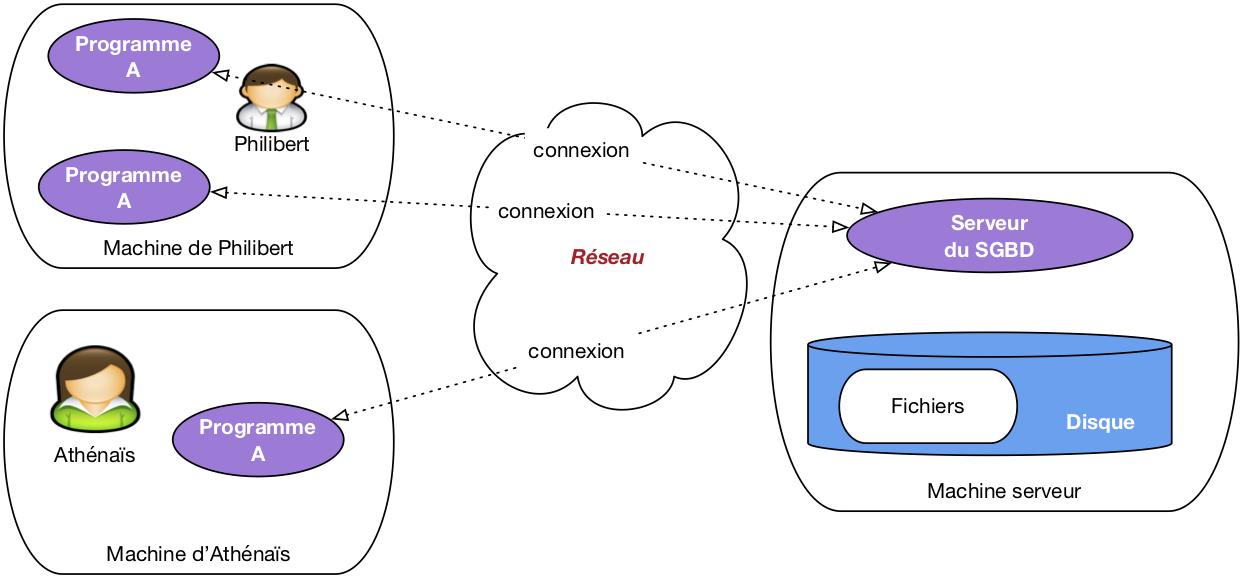 Avec un SGBD, les applications n’ont plus jamais accès directement aux fichiers, et ne savent d’ailleurs même pas qu’ils existent, quelle est leur structure et où ils sont situés. L’architecture classique est celle illustrée par la figure ci-dessous. Le SGBD apparaît sous la forme d’un serveur, c’est-à-dire d’un processus informatique prêt à communiquer avec d’autres (les « clients ») via le réseau. Ce serveur est hébergé sur une machine (la « machine serveur ») et est le seul à pouvoir accéder aux fichiers contenant les données, ces fichiers étant le plus souvent stockés sur le disque de la machine serveur.
