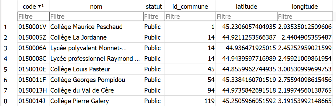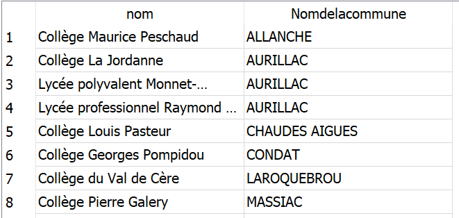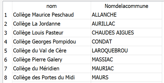 WHERE etablissements.nom LIKE "Collège%"Résultat la table de tous les collèges avec leur commune :