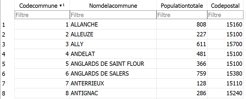 ORDER BY codepostalNous voyons que les codes postaux sont répétés autant de fois qu’il y a de communes desservies par ce code postal.
