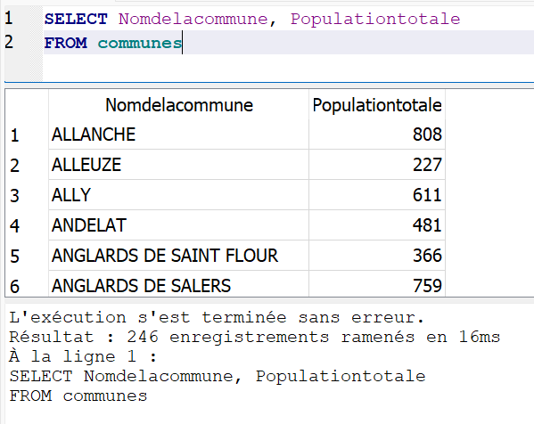 FROM communesCette requête va nous permettre d’obtenir le nom de la commune et sa population pour toutes les communes présentes dans la table “communes”.