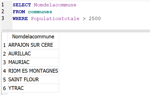 WHERE Populationtotale > 2500La requête ci-dessus permettra d’afficher le nom des communes dont la population est strictement supérieure à 2500 habitants.
