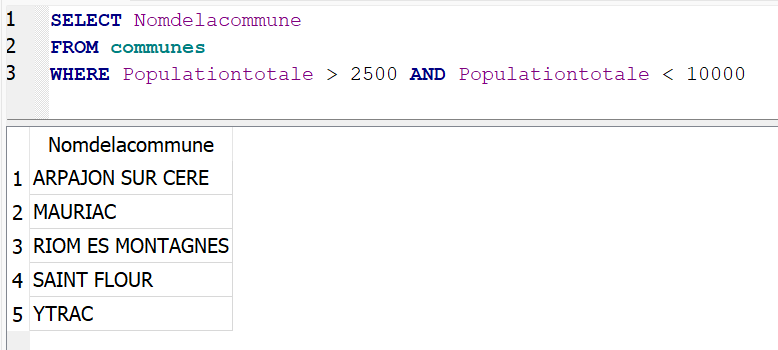 WHERE Populationtotale > 2500 AND Populationtotale < 10000Cette requête permet d’obtenir le nom des communes dont la population est comprise entre 2500 et 10000 habitants.
