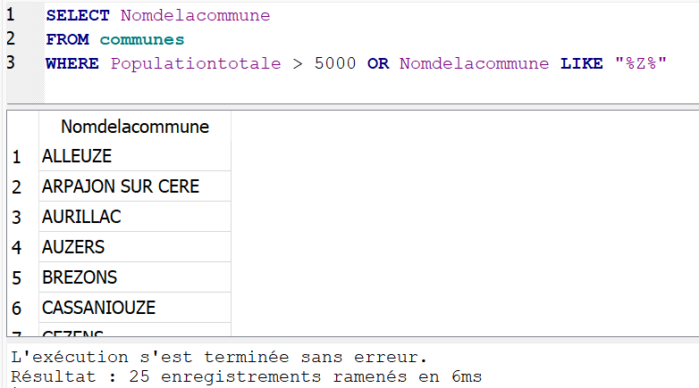 La requête ci-dessous permet d’afficher le nom des communes dont la population est supérieure à 5000 habitants OU dont le nom contient la lettre “Z” (noter le symbole “%” qui remplace n’importe quelle séquence de caractères en SQL).