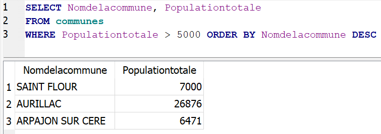 WHERE Populationtotale > 5000 ORDER BY Nomdelacommune DESCCette requête affiche le nom et la population des communes de plus de 5000 habitants dans l’ordre inverse de l’ordre alphabétique de leur nom.