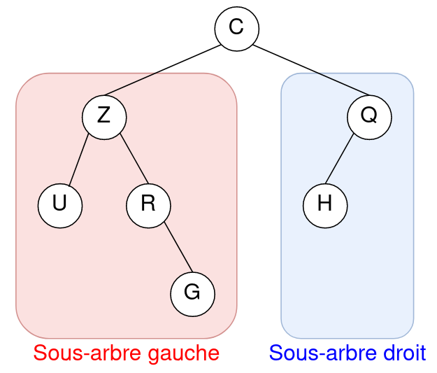 Pour l’arbre représenté ci-dessous, nous avons mis en évidence le sous-arbre gauche et le sous-arbre droit du nœud racine C.
