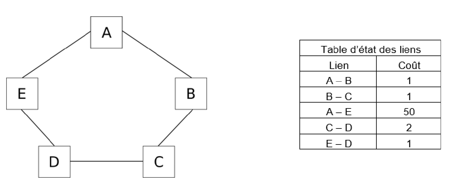 On considère le réseau représenté par le graphe ci-dessous et la table d’état des liens commune à tous les routeurs à un instant donné.