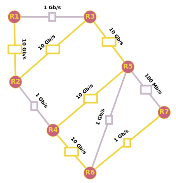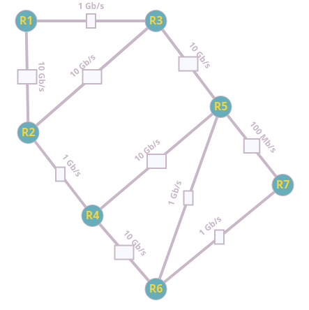Contrairement à RIP, le chemin qu’OSPF nous indiquera sera \(R1 \rightarrow R2 \rightarrow R3 \rightarrow R5 \rightarrow R4 \rightarrow R6 \rightarrow R7\). Ce chemin n’est clairement pas le plus efficace en termes de sauts mais est le plus rapide en termes de débit car il n’exploite pratiquement que des liaisons à 10 Gb/s.