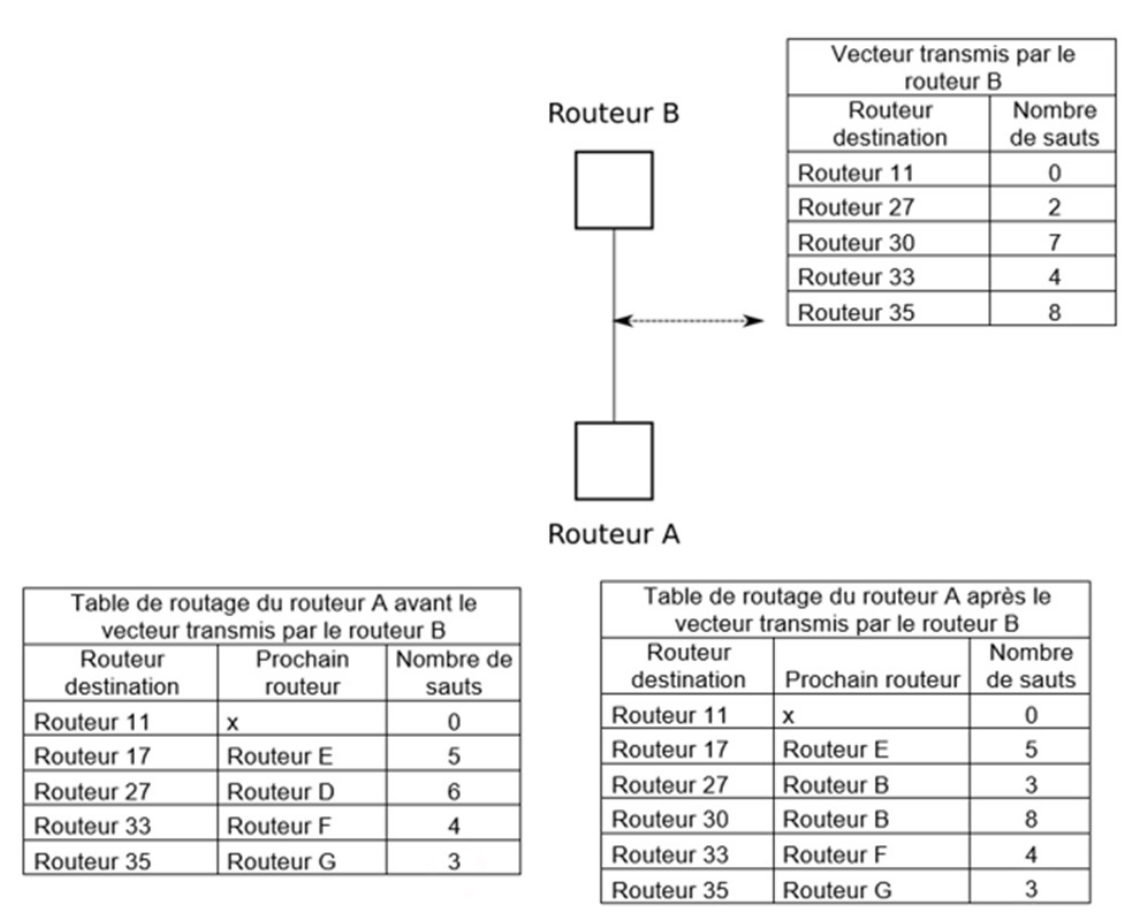 Dans l’exemple ci-dessus, le routeur A reçoit le vecteur transmis par le routeur B.