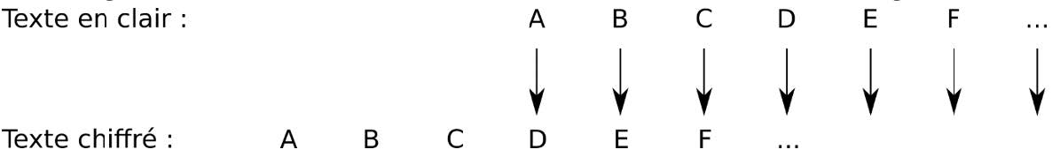 Pour un décalage de 3 lettres, le A devient D, le B devient E… Comme le montre l’image ci-dessous :