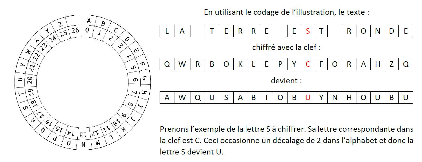 décaler dans l’alphabet chaque lettre du message à chiffrer. Ce décalage est égal au nombre correspondant à la lettre qui a la même position dans la clef partagée. Cela revient à effectuer un chiffrement de César avec un décalage différent pour chaque lettre du message à chiffrer.