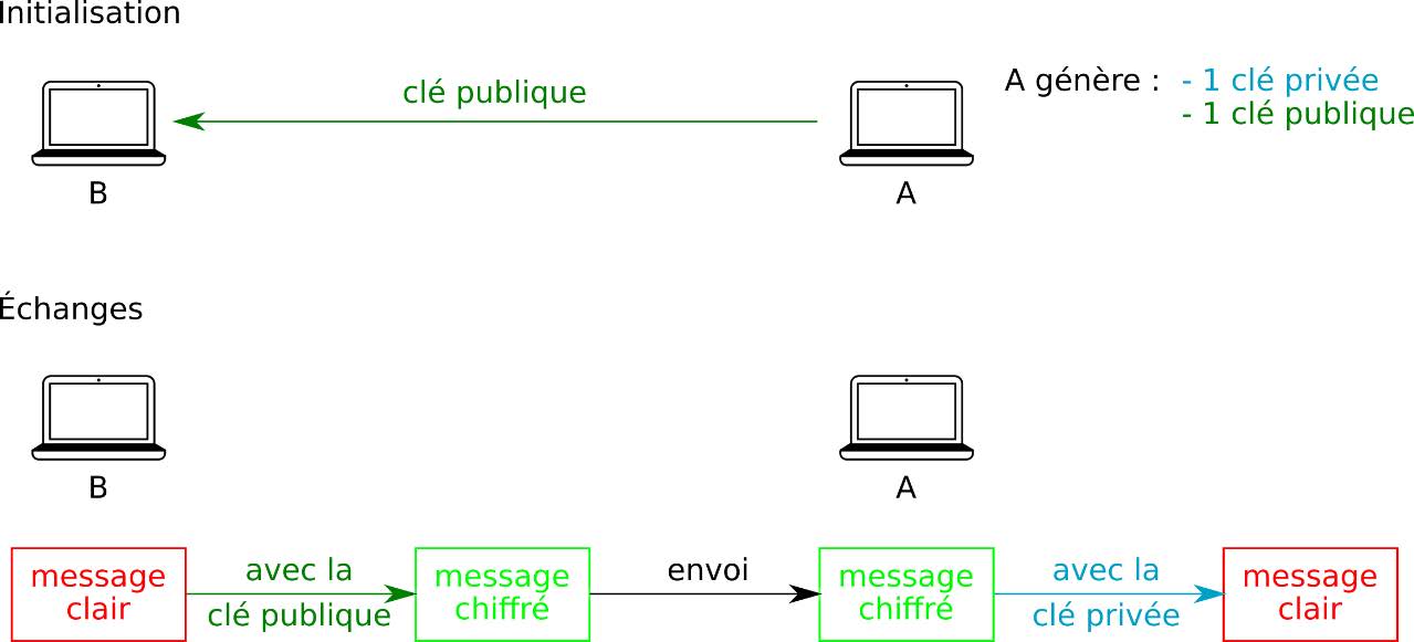 Le chiffrement consiste à transformer, à l’aide d’une clef, un message compréhensible (dit texte clair) en un message incompréhensible (dit texte chiffré). Il est extrêmement difficile, voire impossible, de retrouver le texte clair à partir du texte chiffré pour toute personne qui ne dispose pas de la clef de chiffrement. Le texte chiffré peut alors être envoyé sur un média qui n’est pas sécurisé, puisqu’il est incompréhensible sans la clef.