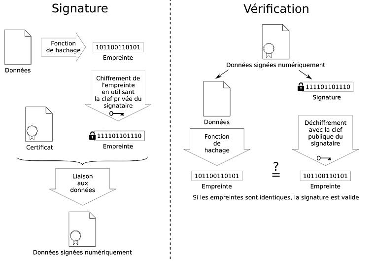 La signature numérique est calculée à partir de la clef privée du signataire et peut être vérifiée en utilisant la clef publique du signataire.