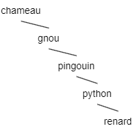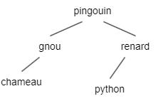 ['chameau', 'gnou', 'pingouin', 'python', 'renard'].On obtient l’arbre :